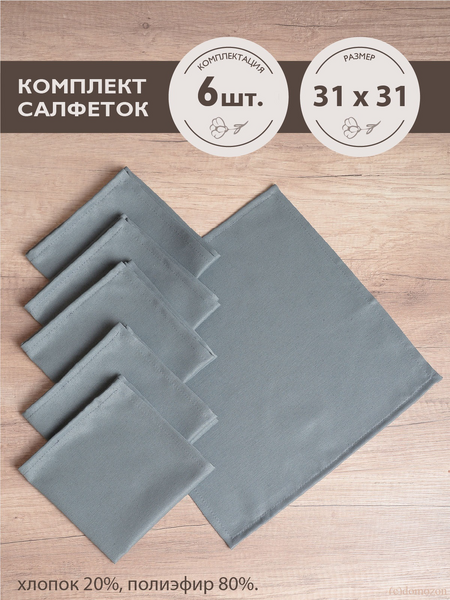 Классические однотонные салфетки на стол. Без рисунка. Размер - 31 х 31 см, набор 6 штук. Состав ткани - хлопок 20%, полиэфир 80%.