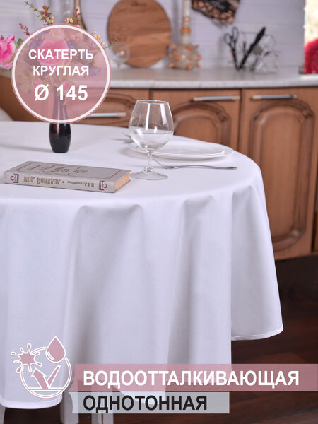 Скатерть на кухонный стол тканевая круглая водоотталкивающая - диаметр 145 см, состав - 20 % хлопок, 80 % полиэфир. Плотность ткани ткани - 190 г/ м2.