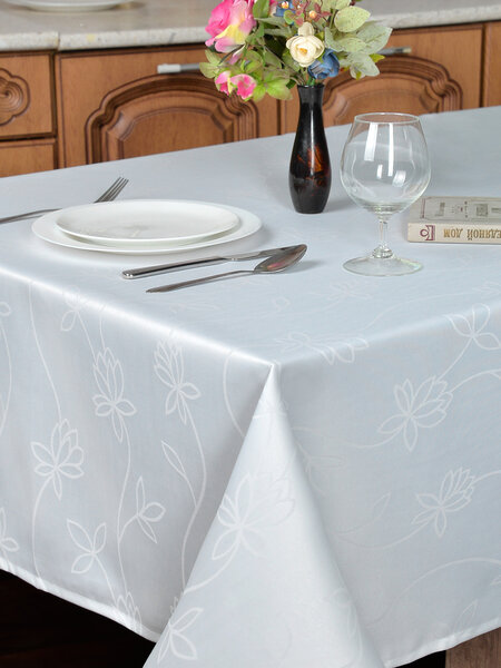 Скатерть на кухонный стол тканевая прямоугольная водоотталкивающая - размер 180 х 145 см, состав - 15 % хлопок, 85 % полиэфир. Плотность ткани - 200 г/м2.