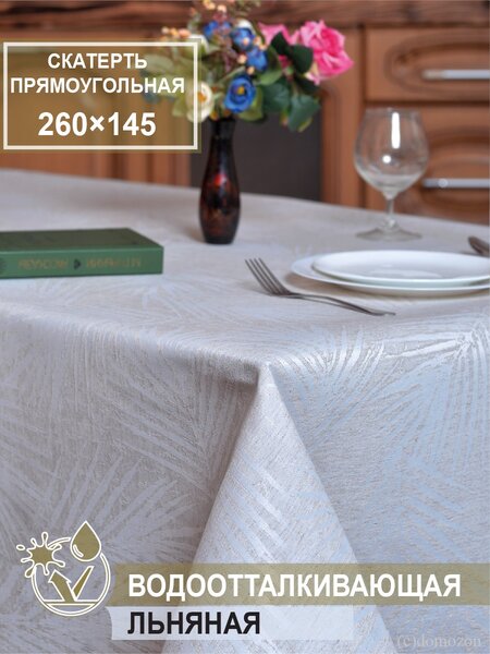 Скатерть на кухонный стол льняная прямоугольная водоотталкивающая - размер 260 х 145 см, состав - 27 % лен, 73 % полиэфир. Плотность ткани - 225 г/м2.